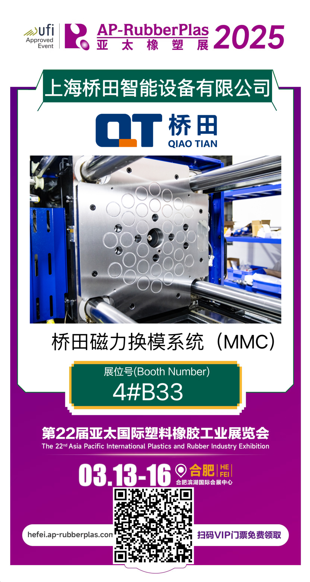 此次,橋田智能將展示自動換模系統(tǒng)全方位解決方案,由磁力換模系統(tǒng)和工業(yè)連接器對插組合模塊組成,涵蓋動板、靜板、控制系統(tǒng)和HMI控制面板。